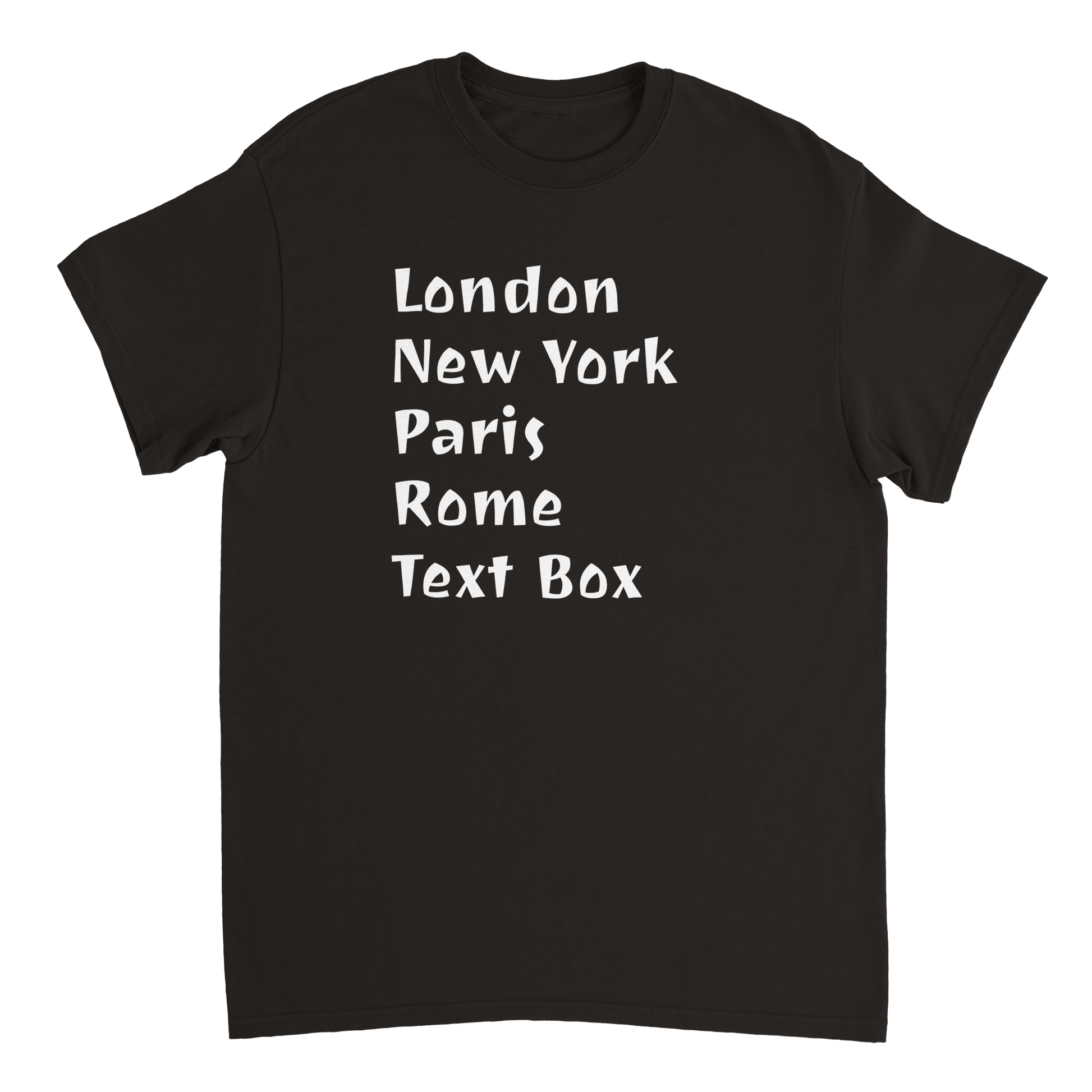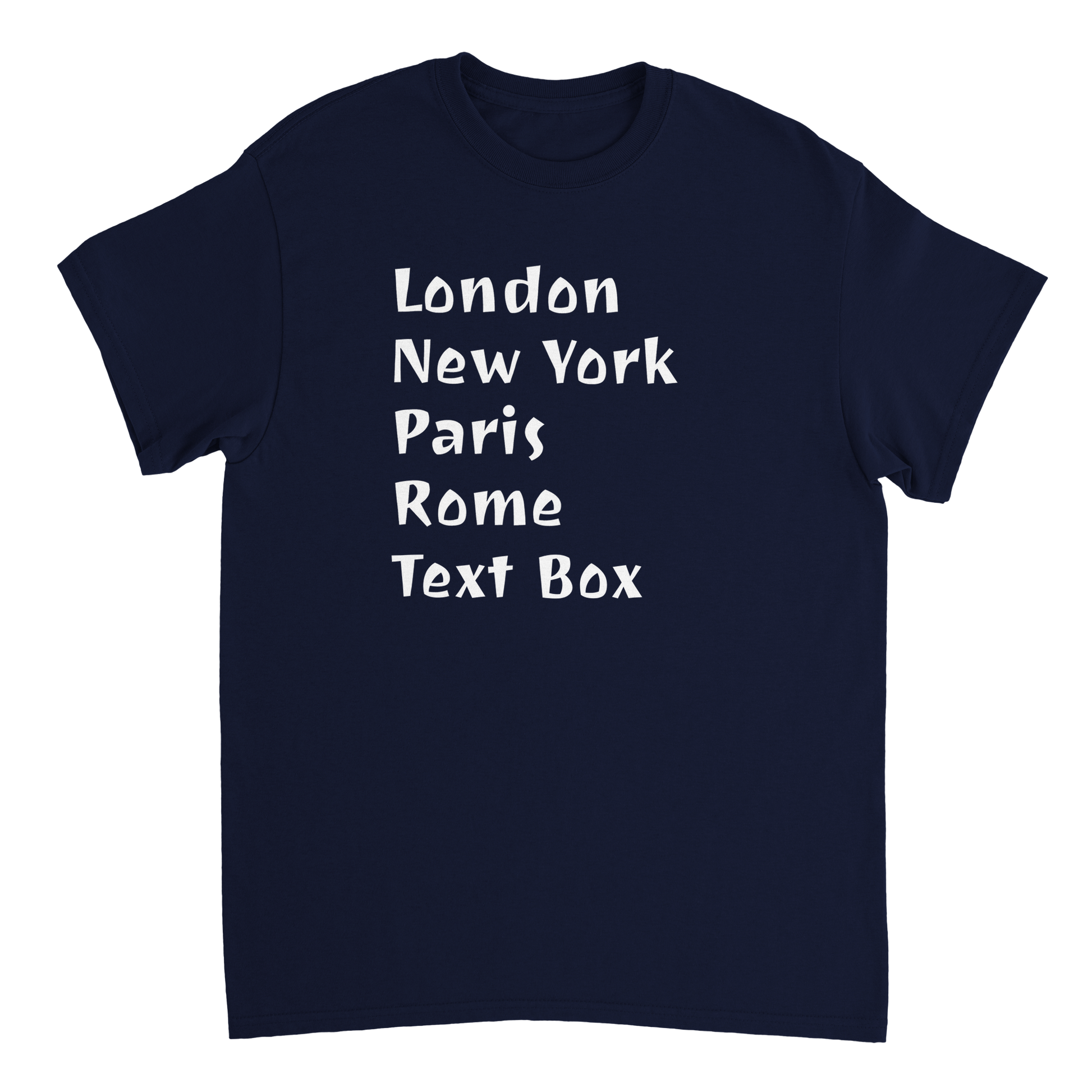 The World's Greatest Cities Tee is the perfect way to add your slice of paradise to the club that is the World's Greatest Cities. Just pop in your chosen City, Town or even Tiny Village in the Personalizable Text Box. Available in 5 Bright Colours.